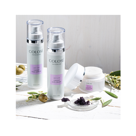 Erlebe pure Luxuspflege mit dem Colosé Kaviar-Serum. Wertvoller Kaviar-Extrakt, Hyaluronsäure, Glycerin, Vitamin E und Provitamin B5 spenden intensive Feuchtigkeit und glätten sichtbar feine Linien und Falten. Der Mineralien-Komplex unterstützt die Regeneration und wirkt Altersanzeichen entgegen. Die leichte Formel zieht schnell ein und hinterlässt eine erfrischte Haut – begleitet von einem zarten, blumigen Duft.